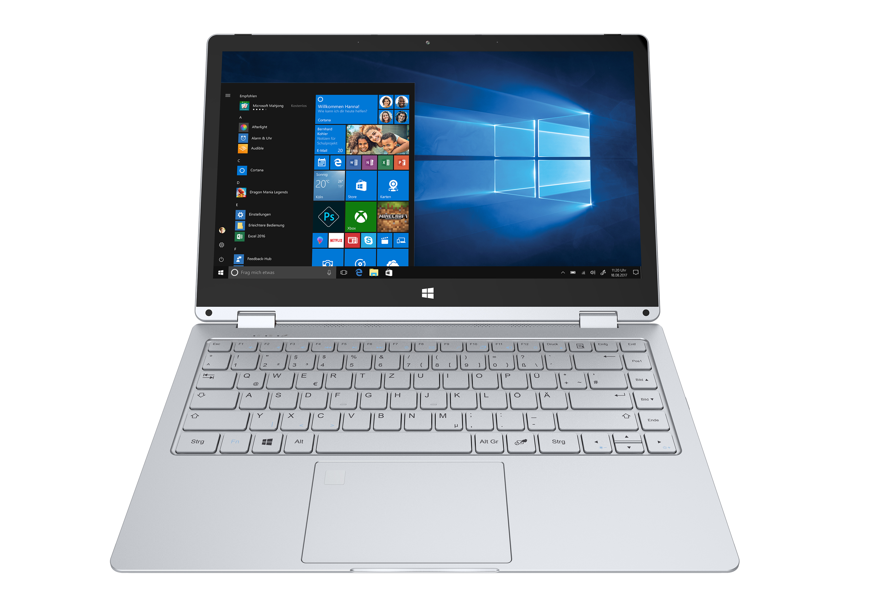 Auf der Frontseite des silbernen Gehäuses aus Aluminium und Kunststoff befinden sich eine 2-Megapixel-Kamera sowie ein Dual-Mikrofon für Video-Chats. Auch Stereo-Lautsprecher hat TREKSTOR verbaut. Die vollwertige QWERTZ-Tastatur und das Touchpad sorgen auch an langen Tagen für komfortables Arbeiten. In das Touchpad ist ein Fingerprint-Sensor integriert, der gemeinsam mit Windows Hello die Identifikation des Nutzers übernimmt. Das Betriebssystem Windows 10 Home mit seiner digitalen Assistentin Cortana ist bei der Auslieferung bereits vorinstalliert.