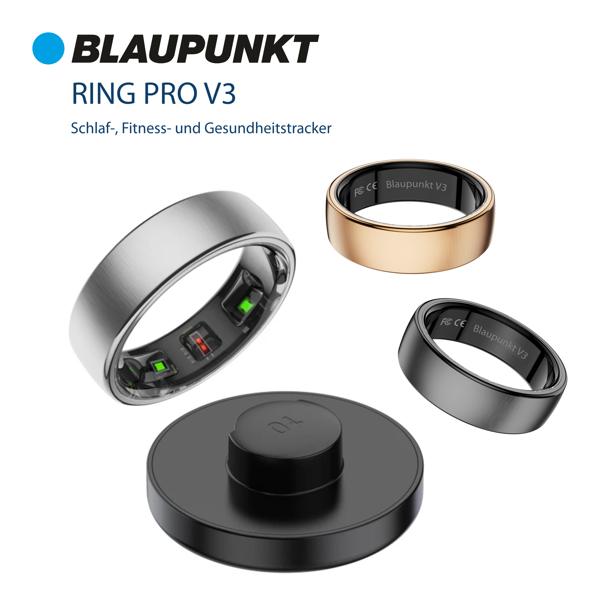 Der Blaupunkt Smart Ring PRO V3 ist ab sofort unter blaupunkt-ring.de zu einer UVP von 169 Euro erhältlich. Zum Lieferumfang gehören der Ring selbst, eine Ladestation mit Kabel, ein Silikon-Ringschoner sowie eine deutschsprachige Bedienungsanleitung. Wer bezüglich seiner Ringgröße unsicher ist, kann vor dem Kauf ein kostenloses* Ring-Sizer-Testset bestellen und die passenden Maße ermitteln.