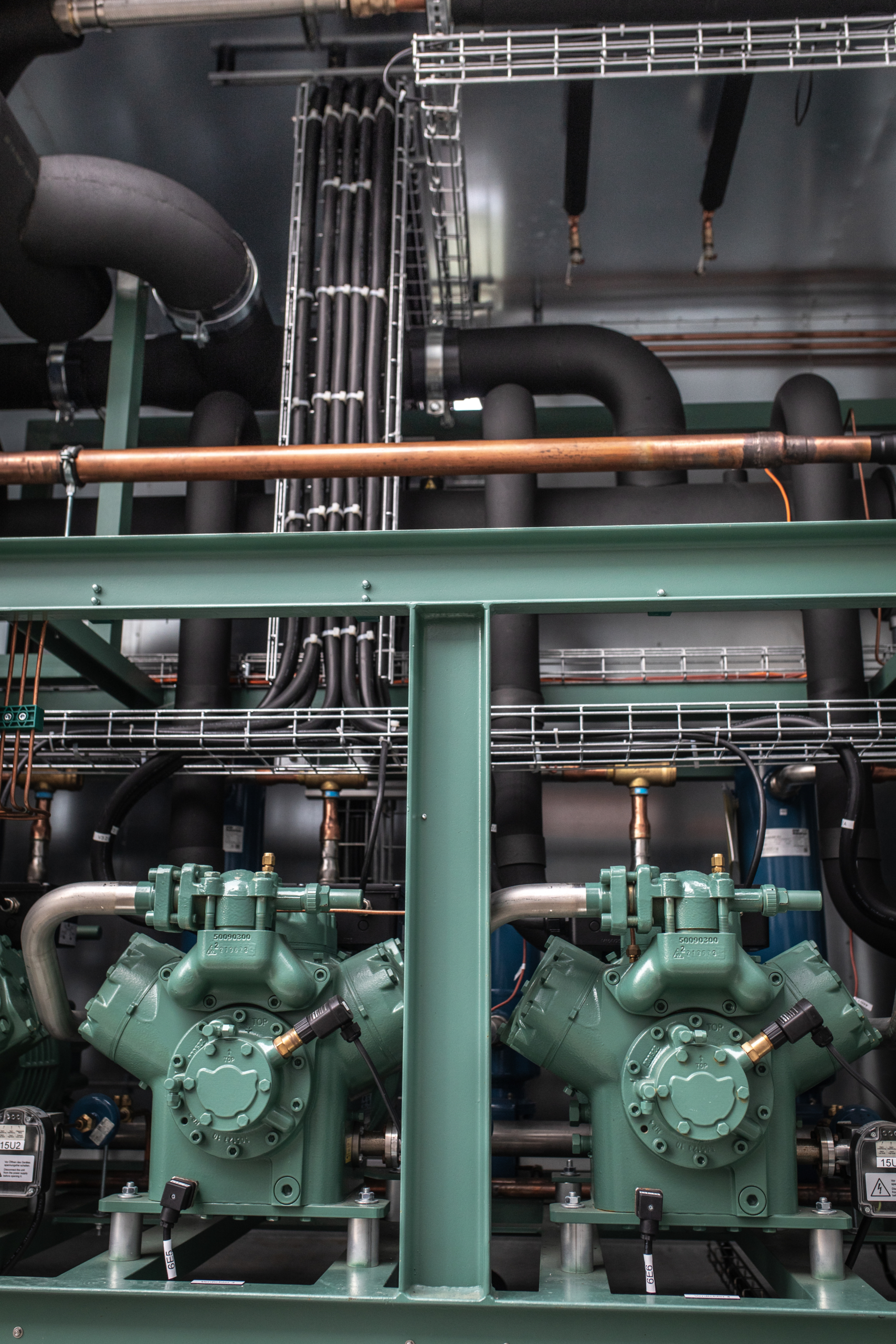Voltavision Kältetechnikanlage mit einem Teil der Verdichter sowie den Leitungen, die ins Labor führen.